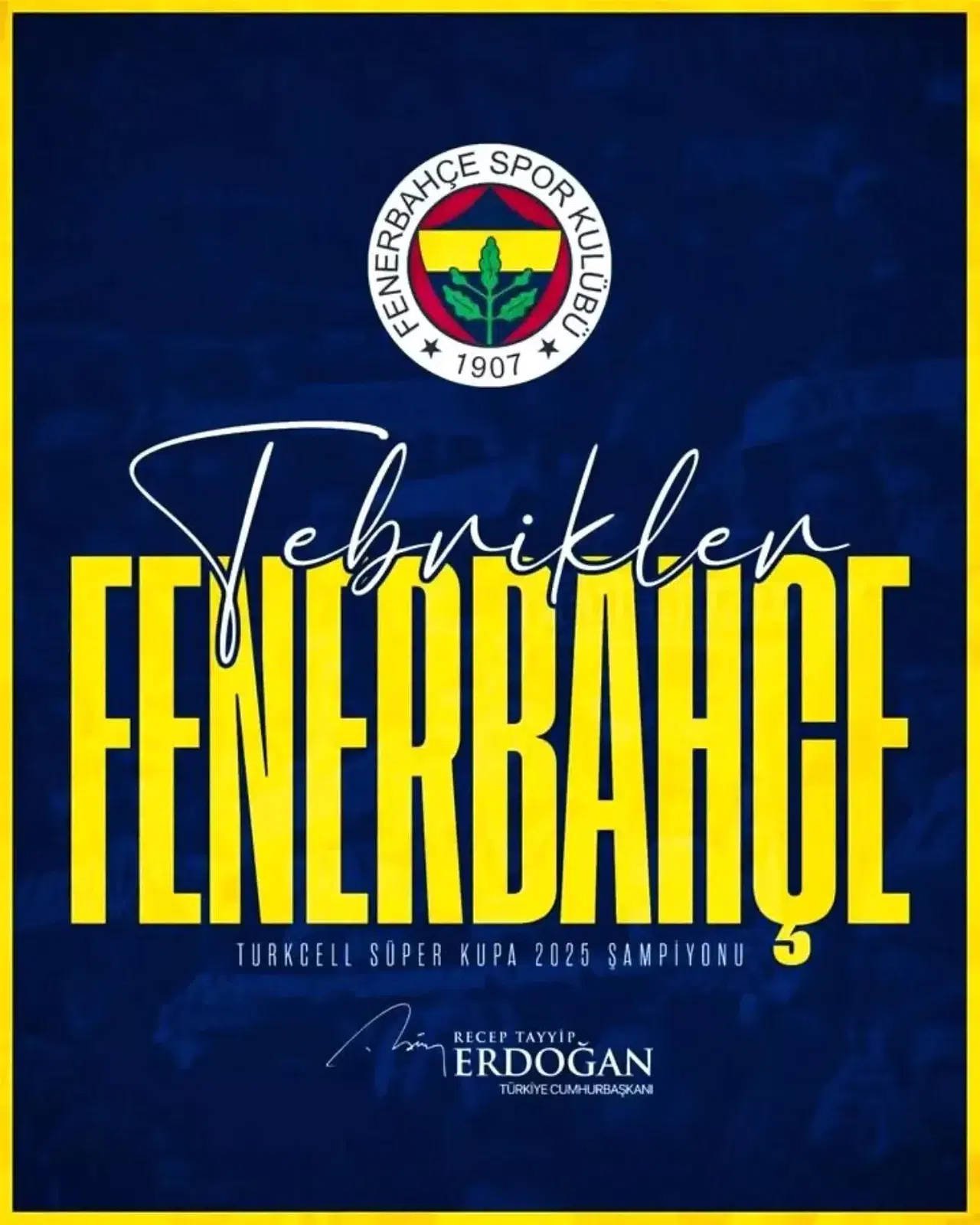 Cumhurbaşkanı Erdoğan, Fenerbahçe'nin başarısına ilişkin yayımladığı tebrik mesajında, "2025 Turkcell Süper Kupa final mücadelesinde Galatasaray'ı mağlup ederek şampiyonluğa ulaşan Fenerbahçe'yi ve tüm Fenerbahçe camiasını gönülden tebrik ediyorum" diyerek, takımın başarısının futbolseverler üzerinde yarattığı olumlu etkilere vurgu yaptı. Bu tür başarıların, Türk futbolunun uluslararası alandaki itibarını artırdığına dikkat çekmekte fayda var.